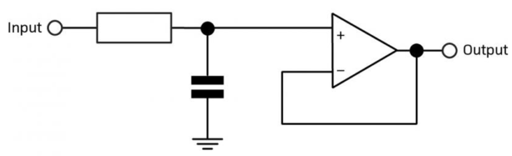Next, if we add 2 resistors, we introduce gain to the LPF. This is mandatory since signals from sensors are small. An MCU cannot read these small voltages.