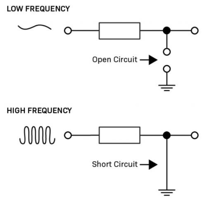 At low frequencies, the capacitor behaves like an open circuit, since the capacitance reactance (Xc) is very large. This allows low frequency signals to pass.