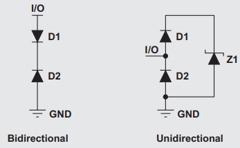 For a unidirectional TVS, in the event of a positive ESD event, D1 conducts and Z1 enters the breakdown region. A path to ground is created, thereby shunting the ESD energy. For a negative ESD event, D2 conducts.