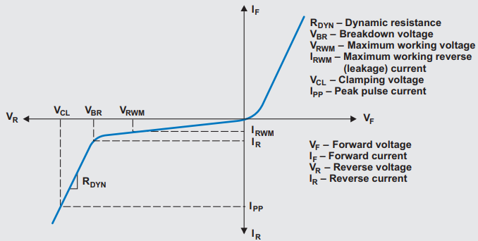 In ESD event occurs in the nanoseconds range. The time it takes for the TVS to conduct and to shunt the dangerous ESD surge is limited by a resistance called dynamic resistance (R_DYN). It should be 0Ω however <1Ω is acceptable.