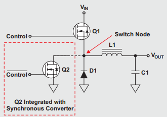 It is composed of a high-side switching FET Q1, the magnetics L1, and the output capacitor C1. For a nonsynchronous buck, D1 acts as a freewheeling diode. In a synchronous buck, D1 is replaced with an internal FET Q2, eliminating the drop (and thus losses) of D1.