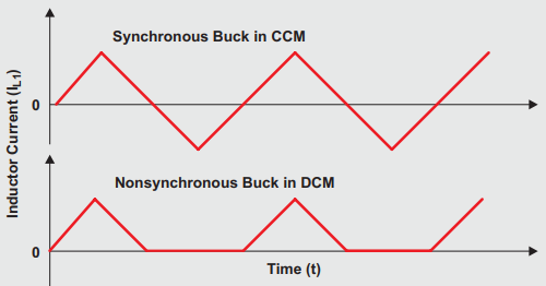 At low-loads, the nonsynchronous converter operates in discontinuous conduction mode (DCM). This means that the full inductor current is delivered to the load before the next cycle begins. Also, since the inductor current never dips below zero, it travels only in one direction. See Figure 3 below.