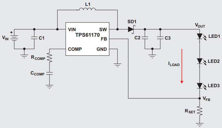 We can modify this topology to drive a constant current (rather than a constant voltage) by replacing the upper leg of the voltage divider with our LED string, see Figure 1 below.