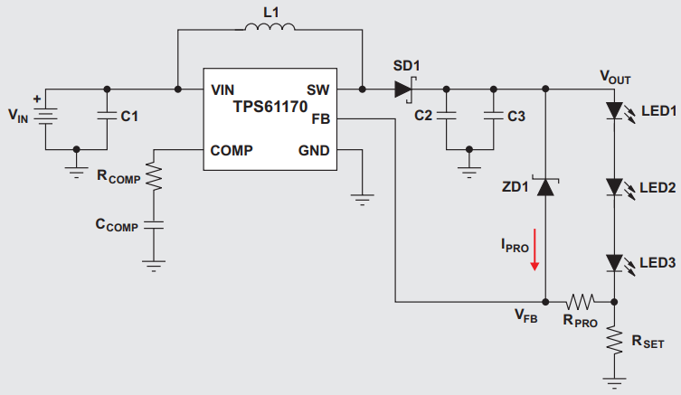 One method to drive high-brightness LEDs is to modify the standard boost-converter topology to act as a constant-current source. However, one issue is that if an open-circuit fault arises in the LED string, the load current pathway is removed. The circuit will have a HIGH OUTPUT VOLTAGE that operates without feedback. This article presents a simple open-circuit protection consisting of a zener diode and resistor. Testing was done by simulating a fault condition. This protection scheme introduces miniscule changes in efficiency.