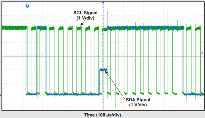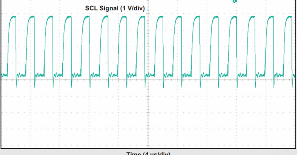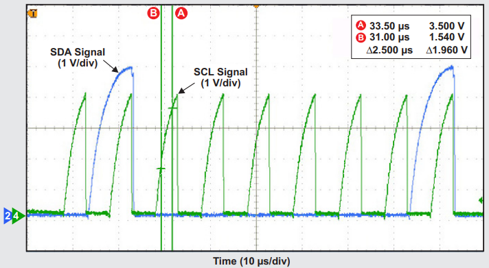 The following figure shows an SCL signal that fails to reach 70% of VCC, let alone 100% VCC. The rise time to 3.5V is 2500ns. This violates the I2C specification which states a maximum rise time of 1000ns.
