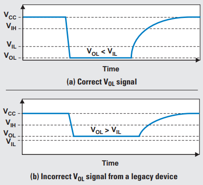 In such instances, when the P-channel FET (PFET) and N-channel FET (NFET) conduct simultaneously, bus contention occurs as one device is pulling the line high while the other is pulling it low. This results in a very high V_OL which is interpreted as an unknown state.