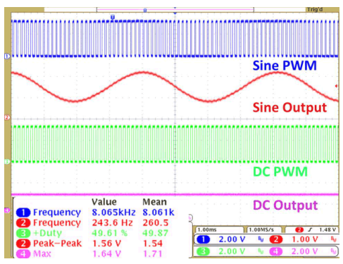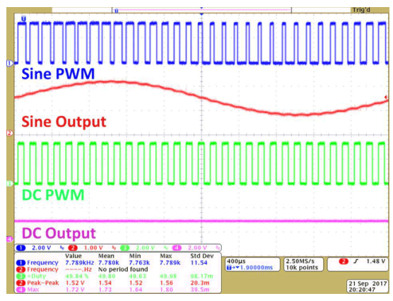 Looking at Figure 1 below, the duty cycle of the sine-PWM signal varies from one PWM period to the next, whereas the duty cycle of the DC-PWM signal remains fixed.