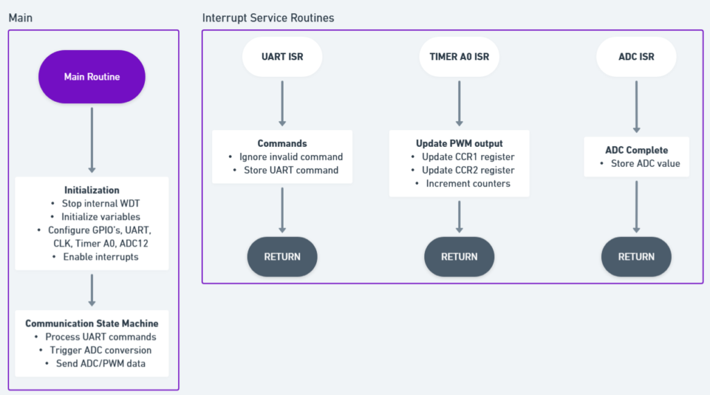 The CCR0 interrupt is enabled and the ISR updates the PWM duty cycle which is stored in CCR1.