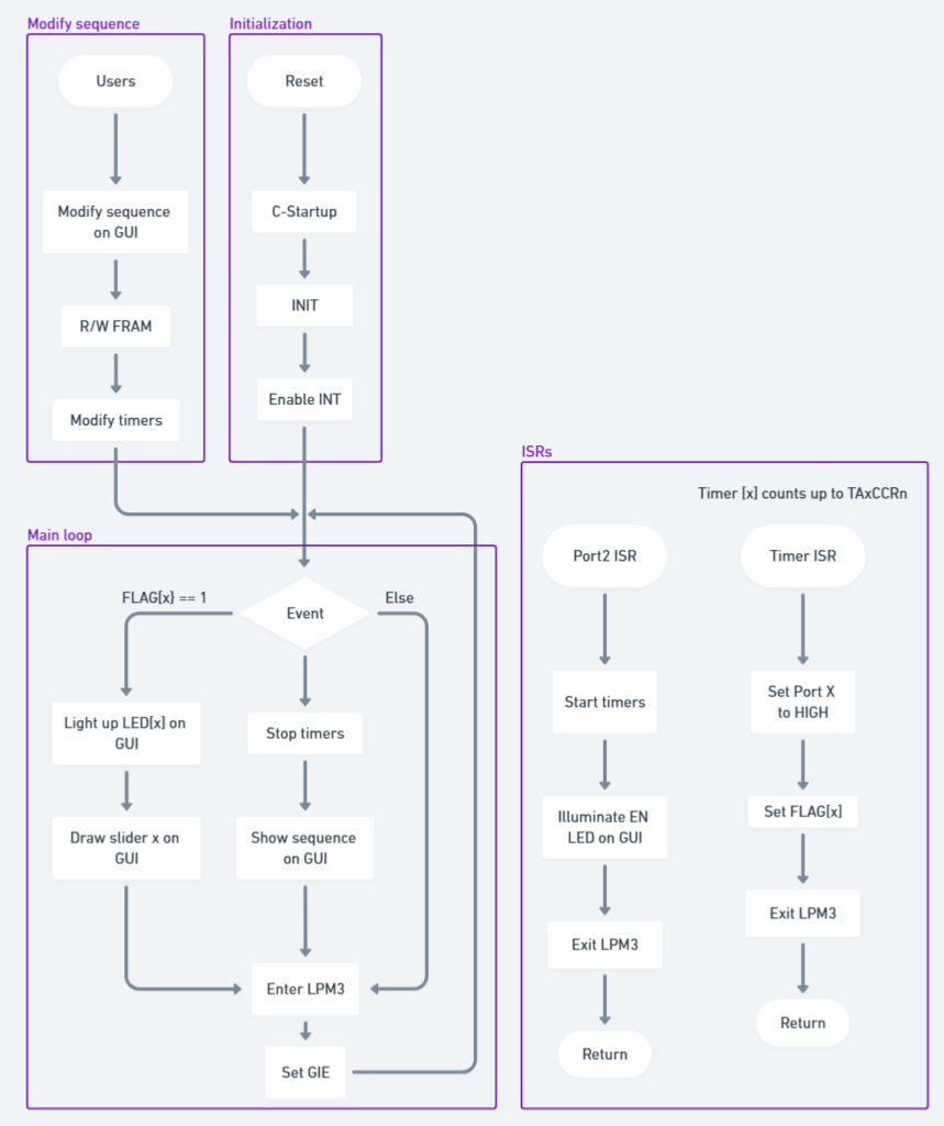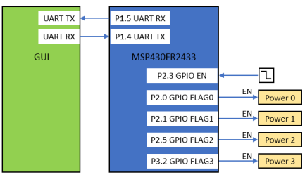 Two timers with two comparators each are used to generate the interrupts. Timer A capture/compare registers (TAxCCRn) is used. The power sequencing is transmitted on pins P2.0, P2.1, P2.5 and P3.2. See the wiring diagram below.