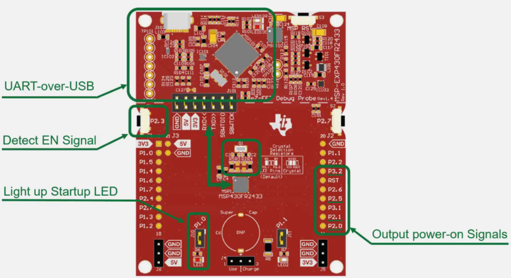 Once a HIGH is detected on the EN pin, the MCU wakes up from LPM. Afterwards a timer module begins counting. The 4 GPIO’s will go HIGH according to the thresholds set by the GUI.