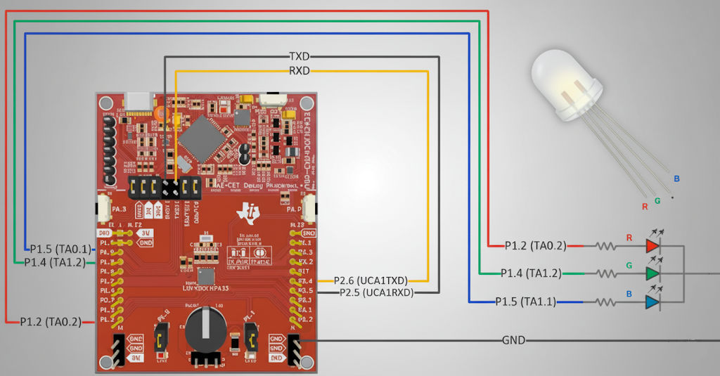 Timer_A0 and Timer_A1 are configured to output varying duty cycle PWM waveforms on P1.2 (red), P1.4 (green), and P1.5 (blue). See the wiring diagram below: