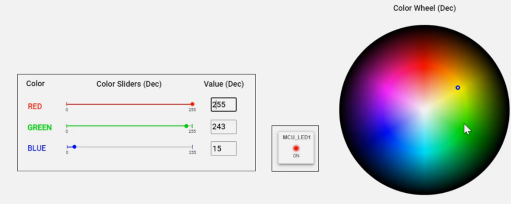 As mentioned previously, the color of the individual R, G and B LEDs can be configured by typing in the textbox or adjusting the slider. To get a unique color, the color wheel can be used.