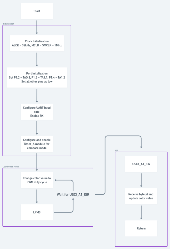 A UART is used to communicate a 8-bit value (0-255 decimal) to the R, G and B LEDs. The MSP430 converts these values into an appropriate PWM waveform.