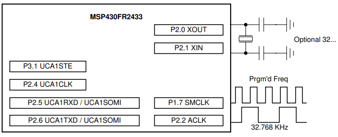 The MSP430 can be used to generate a range of frequencies with or without an external oscillator. Using the internal Digitally Controlled Oscillator (DCO) in tandem with the Phase-Locked Loop (PLL), 1MHz, 2MHz, 4MHz, 8MHz or 16MHz can be outputted to a GPIO.