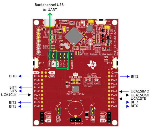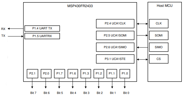 The MSP430 connects to a host controller via the SPI bus (SLCK, MOSI, MISO, CS). See the connections below
