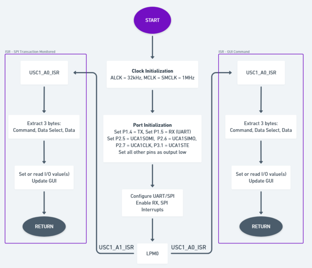 The main program initializes the clock, ports, UART and SPI modules before entering a low-power mode. Then the program waits for one of to interrupt requests.