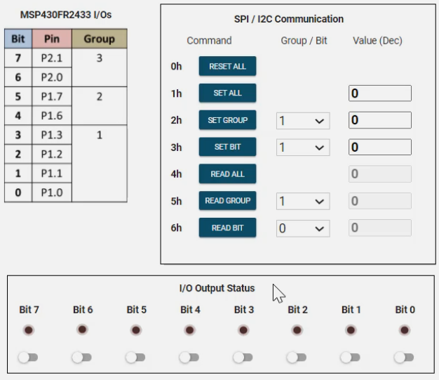The target device will decode the 3 bytes into the command, data select, and data bytes and then set or read the appropriate values on the 8-bit expanded I/O port. Those values will be updated into the GUI, and the program will return back to low-power mode 0.