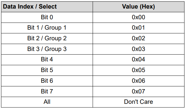 The second byte is data index. It determine which bit/group to read/write to. See table 2 below for the possible operations.