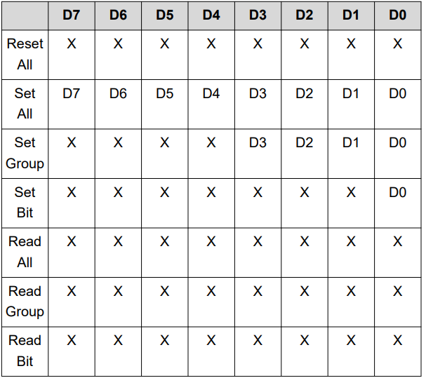 The 8 I/O’s (bits) are grouped into 3 groups. There are 7 possible commands.