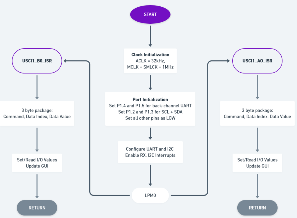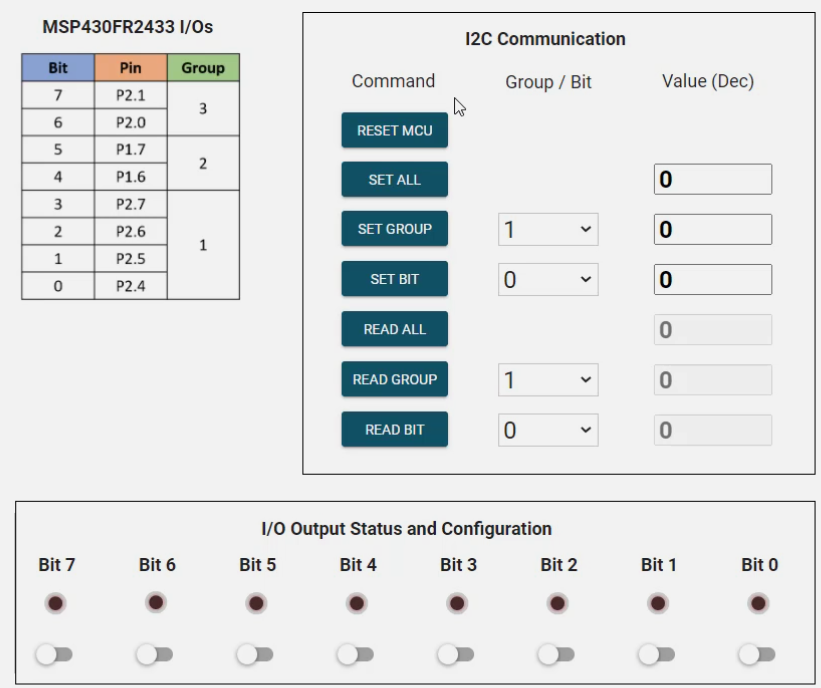 This project treats the MSP430 as an I2C expander which will supply 8 additional I/O’s to the host controller.