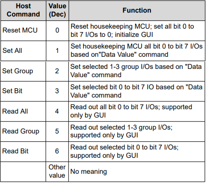 The data value byte contains the 8-bit value to be transmitted to the I/O port, group or bit. Table 3 below lists the possible actions: