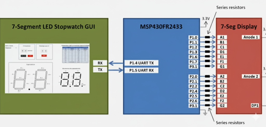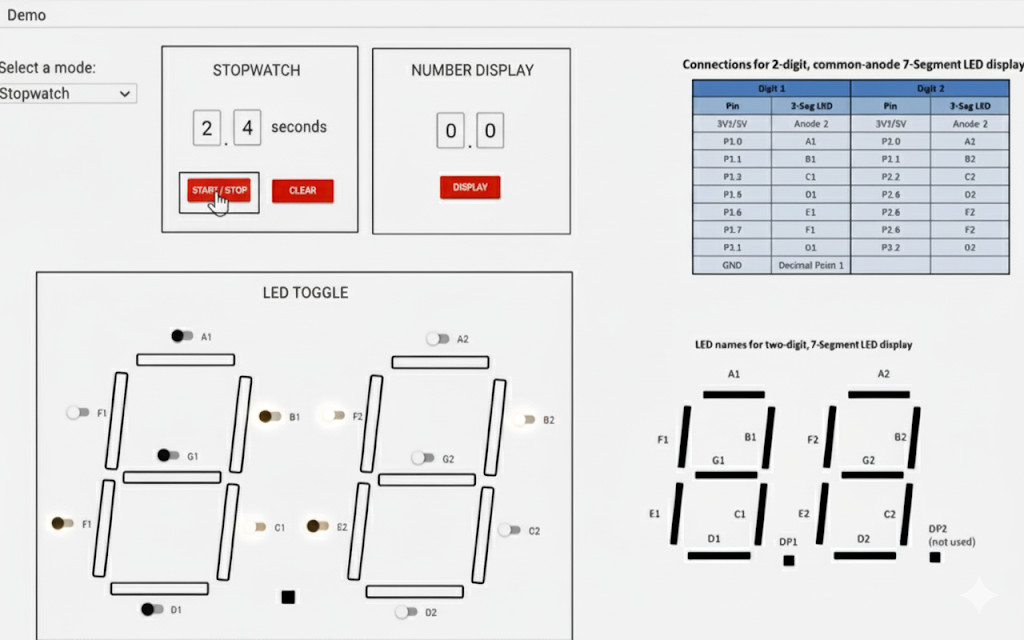 This project uses a a two-digit 7-segment display to implement a stopwatch. The MCU measures the timer using timer A. The LEDs are driven via the GPIOs. The GUI will have two buttons. One to trigger and halt the stopwatch. The other to clear the stopwatch.