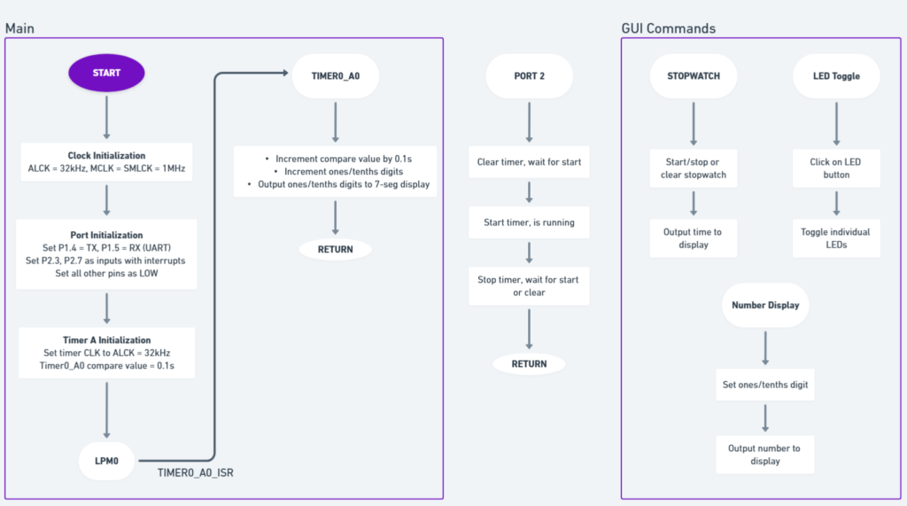 Timer_A0 is initialized to interrupt every 0.1 seconds. When a Timer_A0 interrupt occurs, the current time is incremented and outputted to the 7-segment display. When the Timer_A0 interrupt is inactive, the MSP430FR2433 enters a low-power mode.