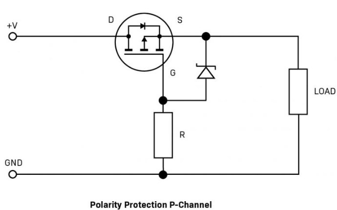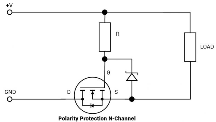 In the following circuit, if polarity is reversed, the FET switches off since it’s reverse-biased. The Zener and resistor limit the V_G to a safe level