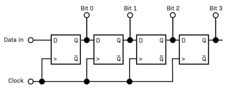 In the following circuit, a serial stream of 1s and 0s gets shifted into the next D flip-flop. After 4 pulses, a 4 bit value can be read.