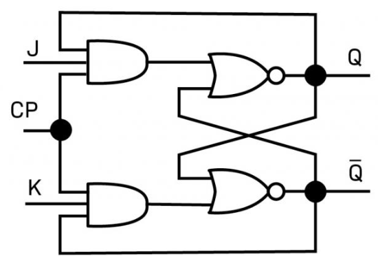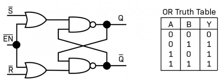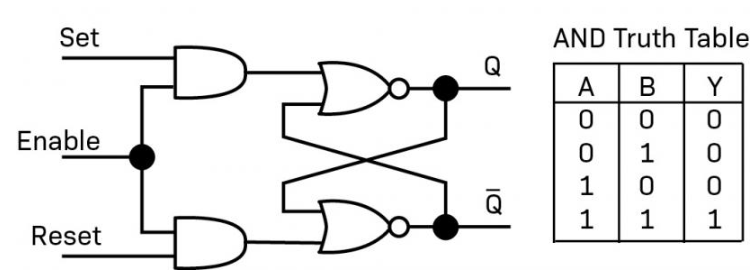 To turn an SR flip-flop into a JK flip-flop, we add two AND gates. Each AND gate takes one of the Set/Reset inputs and a shared Enable/Clock line. Only when Enable is high will Set or Reset pulses propagate into the latch.