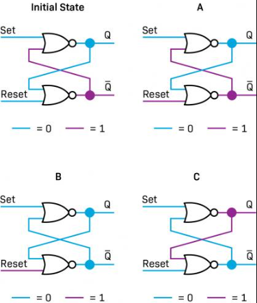 - Since two LOW inputs are in the upper NOR Gate, Q goes HIGH (This is state C)