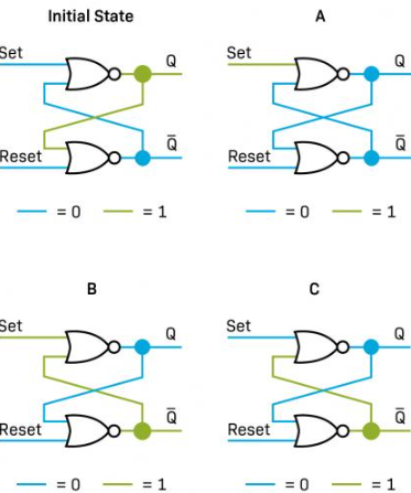 - We begin with the Initial State. Q = HIGH. In reality, at power-up both NOR outputs could momentarily go high, but one gate will win and settle first
