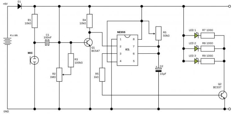 Premise: An electret mic + transistor preamp triggers a 555 monostable to flash high-brightness LEDs via a BC547 transistor