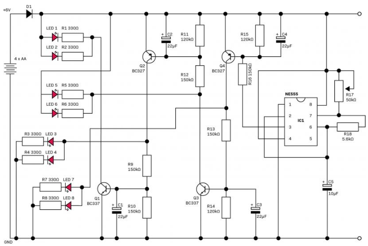 This connection a introduces a “propagation delay” **** and when paired with the RC charge network, it results in the LEDs lighting up one after another. They will fade out in the same order.