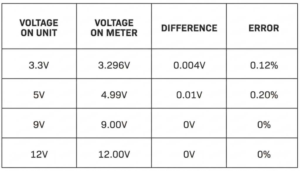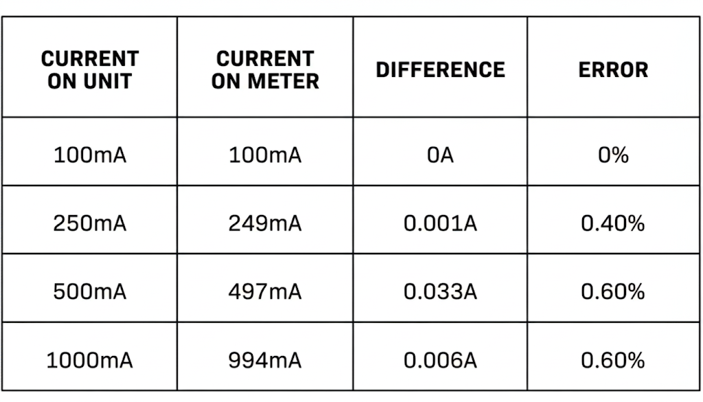For current accuracy, the supply was fixed at 12 V, and the load was varied until the supply indicated 100 mA, 250 mA, 500 mA, and 1 A.