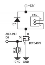 - For the fan control circuit, the temp variable is mapped to a PWM value from 0 – 255. This drives the gate of the FET.