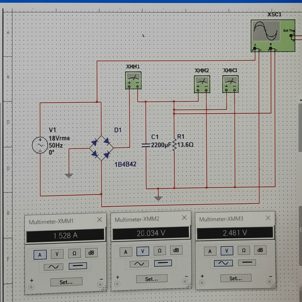 To check voltage accuracy, we applied a 500 mA load to the circuit and used the voltage adjustment potentiometer to set outputs of 3.3 V, 5 V, 9 V, and 12 V, verifying each with a multimeter.