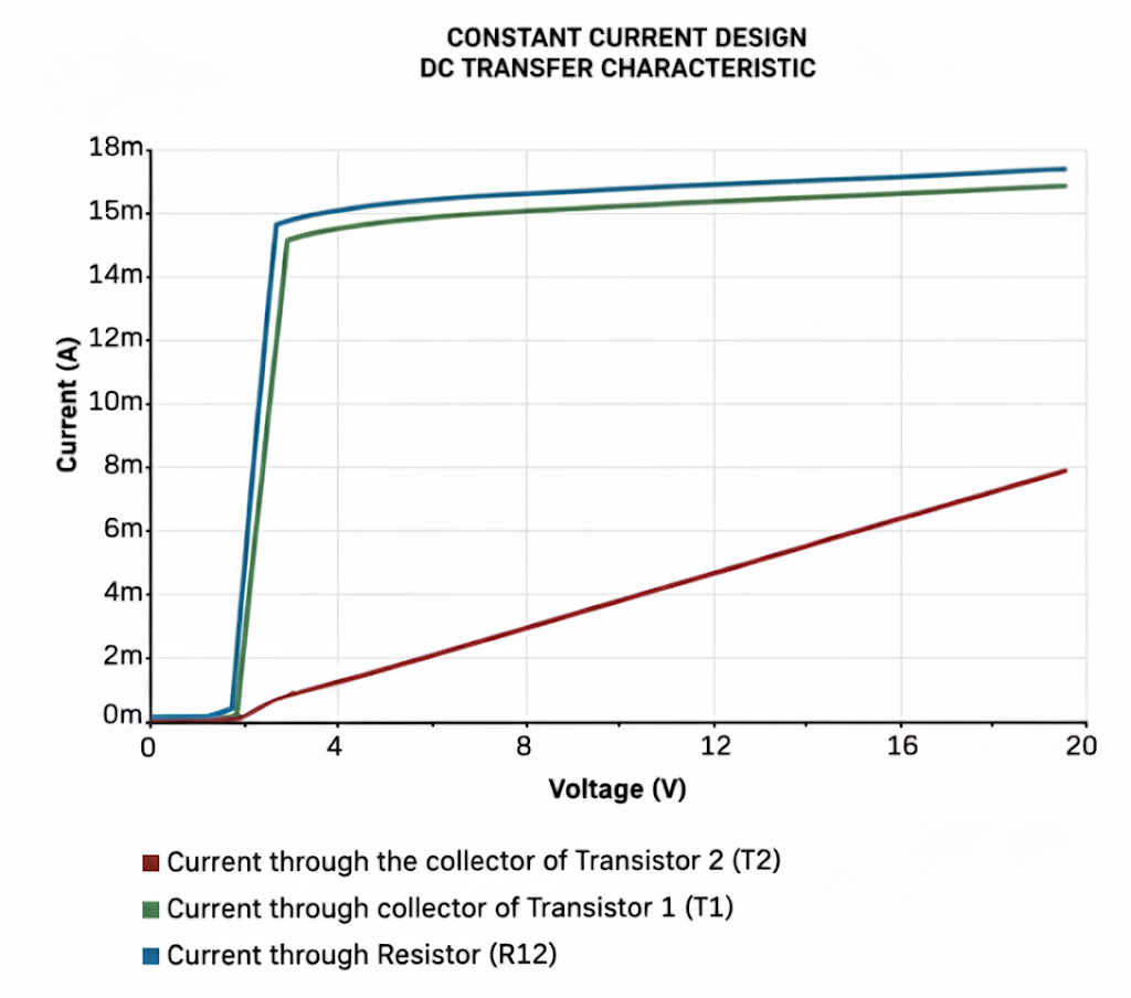 - As the current increases the voltage drop across R12 increases UNTIL it surpasses V_BE of T2