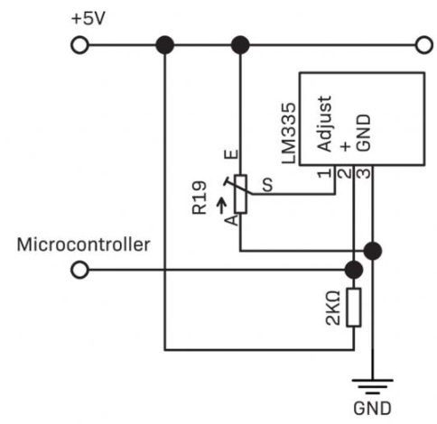 The LM335 will be used. It has a linear output, it’s cheap and commonly available. It can easily be interfaced to an MCU via a voltage divider.