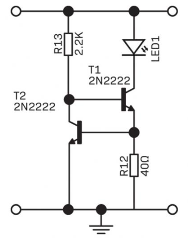 - This diverts current away from the base of T1, reducing the amount of current flowing from its collector to emitter and thus the current through the LED