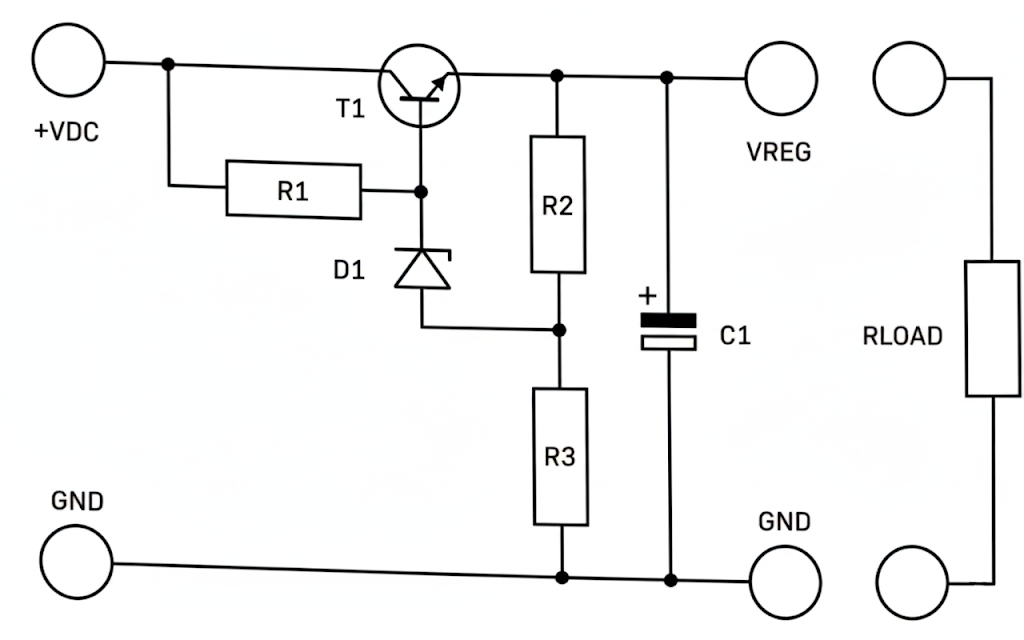 A linear regulator passes an input voltage to the output via a pass transistor which is controlled by a zener diode.