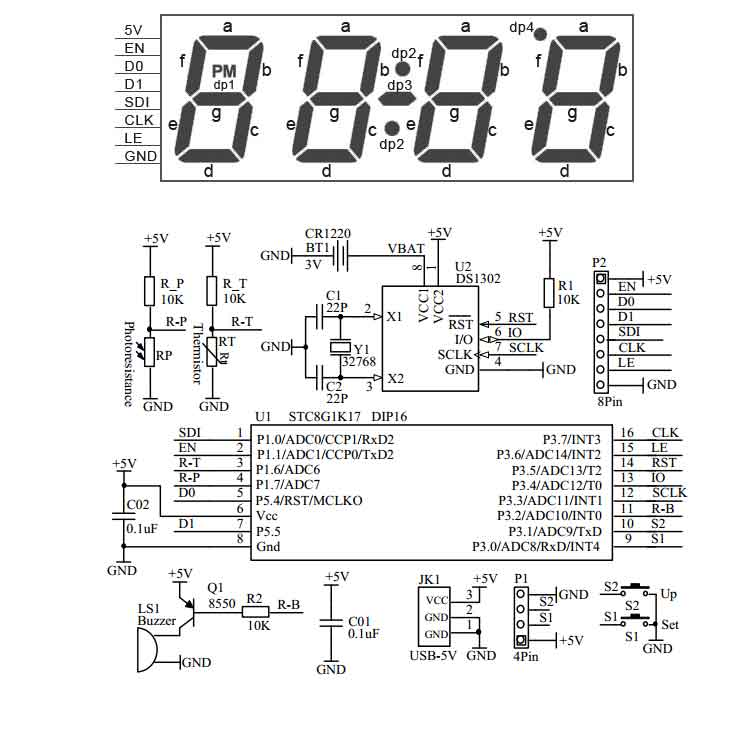 The pinout for the 4-digit 7-segment display is unique. Usually it’s DIG1, DIG2, DIG3, DIG4, a, b, c, d, e, f, g.