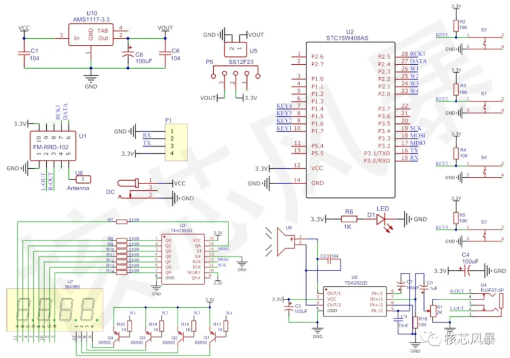 - TDA2822D is a low-power audio amplifier, responsible for driving the speaker
