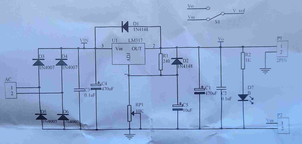 220V AC power is reduced to 12V AC by a transformer, rectified by diode D3-D6, filtered by capacitors C3 and C4, then sent to the LM317.