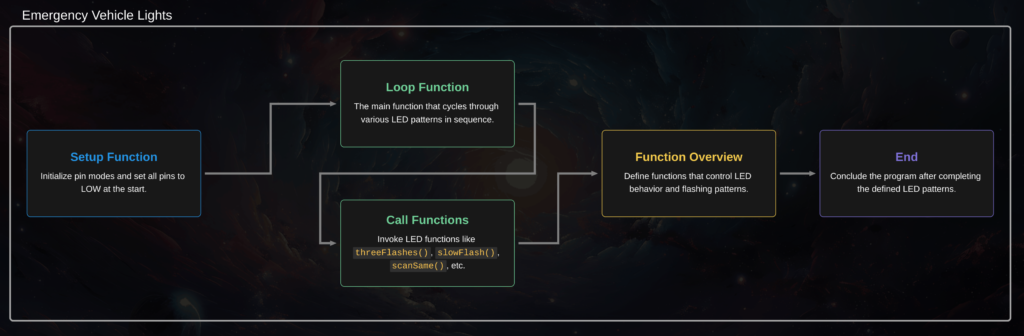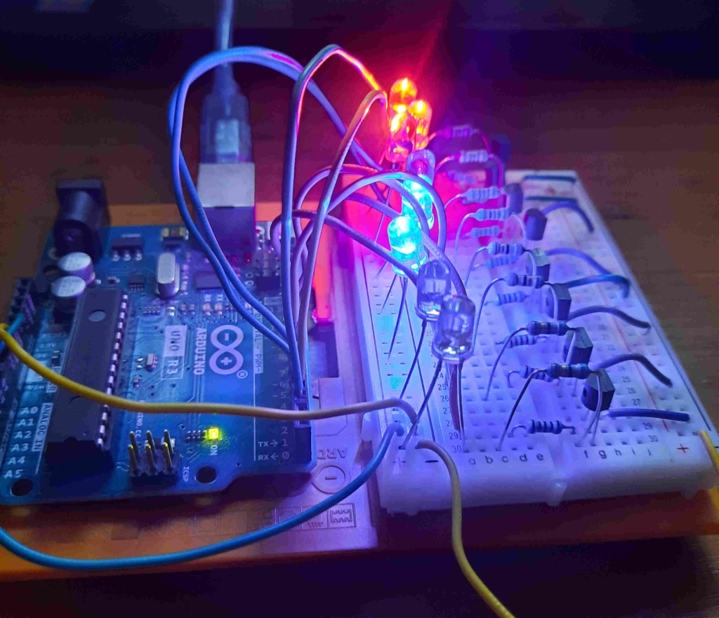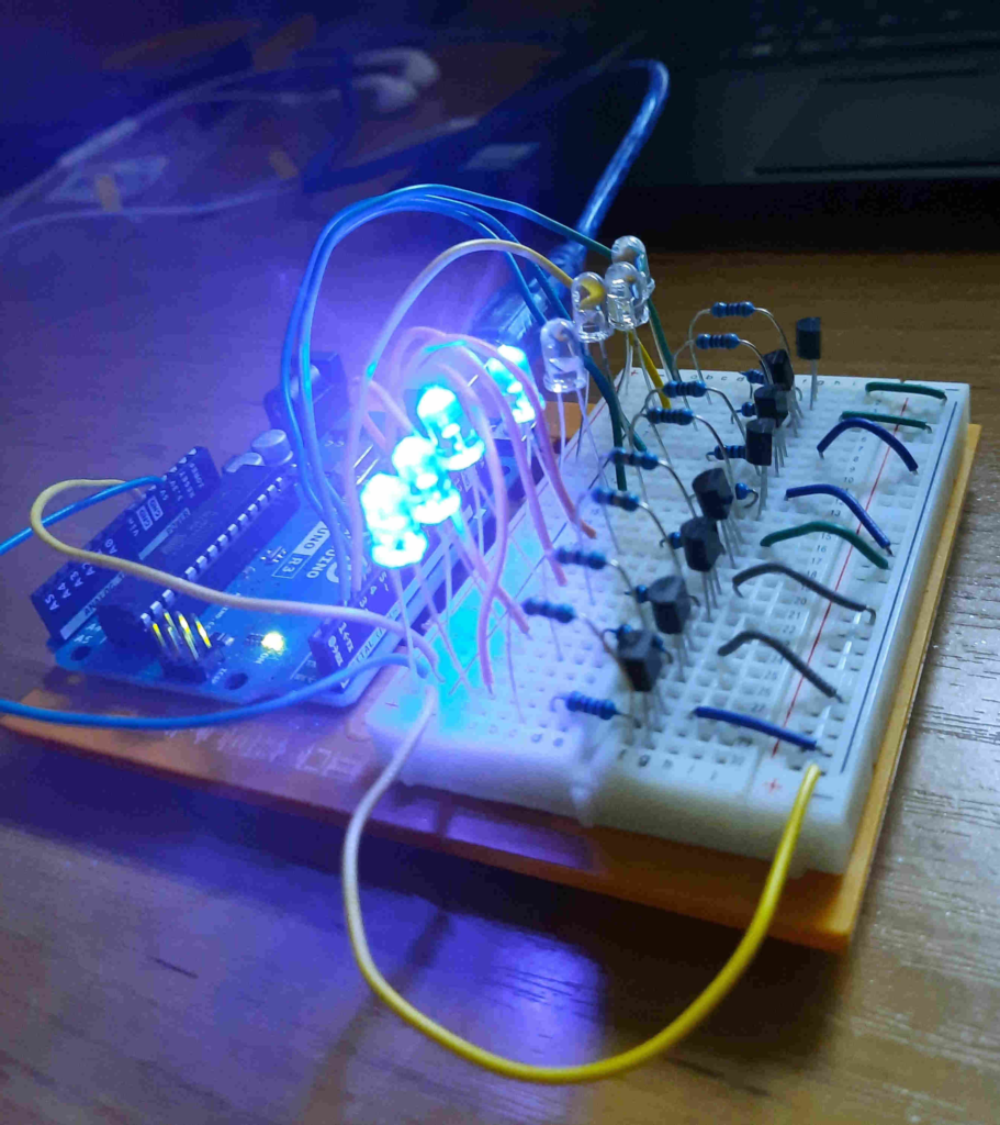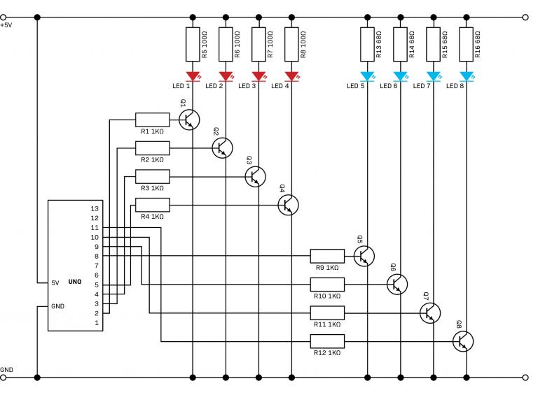 This projects recreates the emergency vehicle lights seen on emergency vehicles. It uses an Arduino Uno, eight high-brightness LEDs (four red, four blue), and BC547 transistors