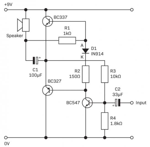 One end of the speaker connects to the emitters of BC337 and BC327, which provide current amplification