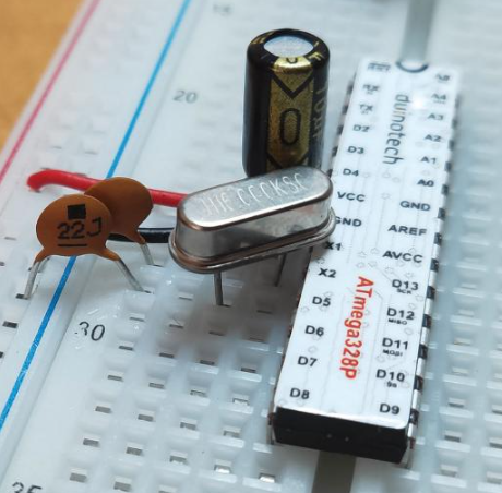 I have opted to use the ATmega328p (which is the heart of an Arduino Uno) rather than the Arduino Uno itself to reduce space. All we need to do to make it function is add:
