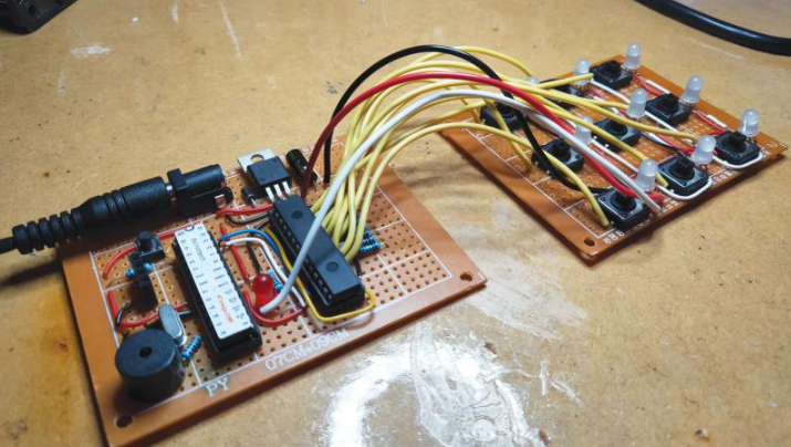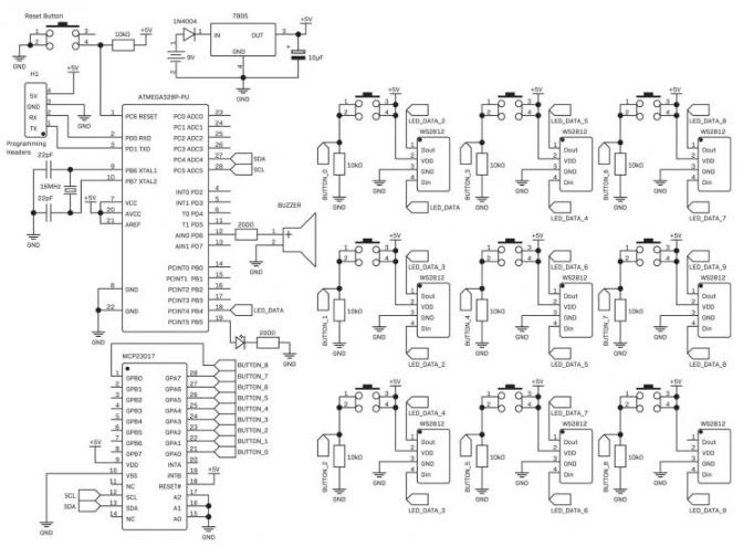 The main build expands on the prototype by adding 9 LEDs, 9 buttons and a buzzer.