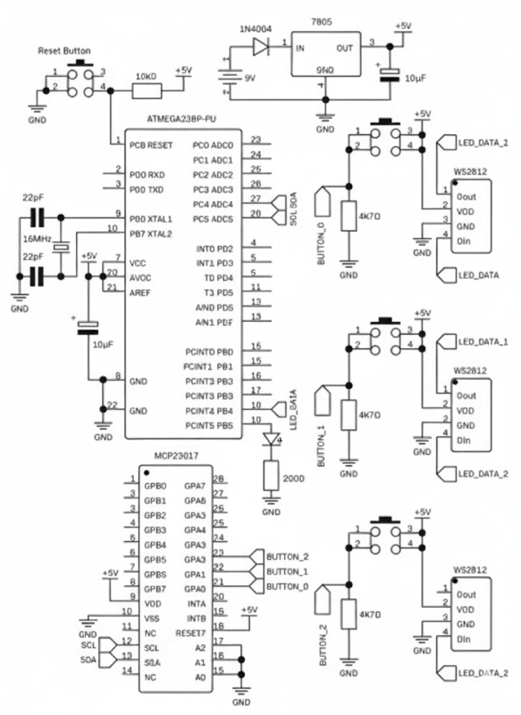 The ATmega328p and the I/O extender will occupy the bottom subassembly called the control board. The pushbuttons and RGB LEDs will occupy upper subassembly called the button board