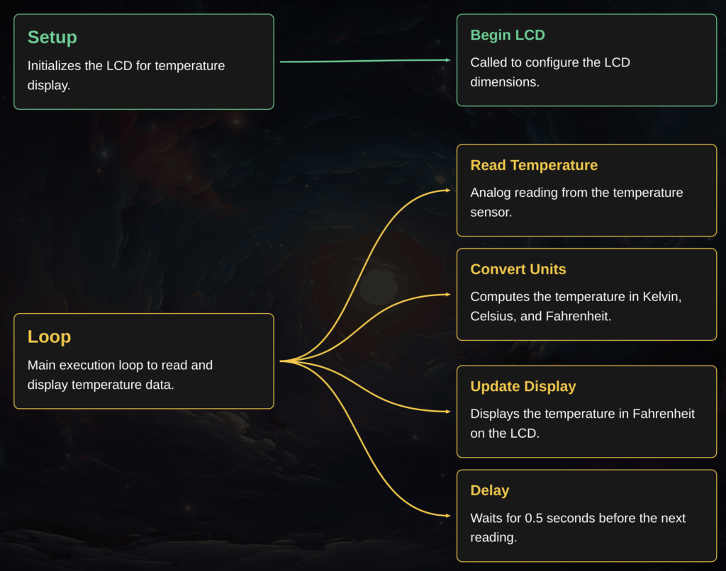 Initially, it sets up the LCD for display and continuously reads temperature readings from an analog pin inside a loop.